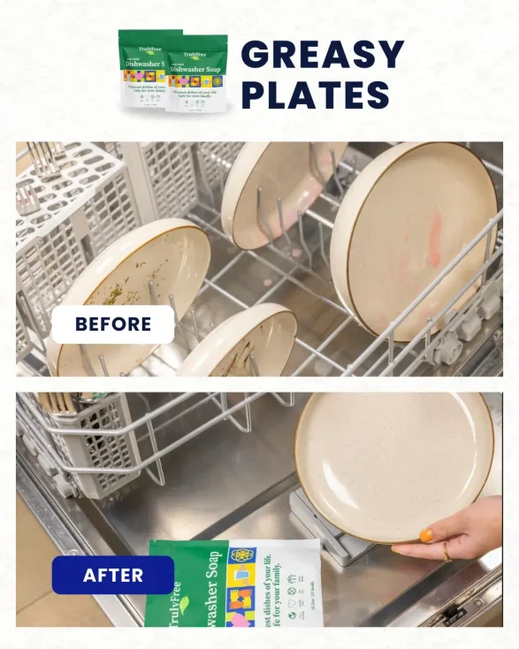 Truly Free Home Non-Toxic Dishwasher Soap removes tough food and leaves dishes spotless—without harmful residues for a powerful, eco-friendly clean.
