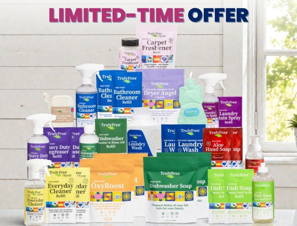 Every time you order refills of Truly Free Home's non-toxic cleaning laundry and cleaning supplies, you help save single-use plastics from ever being made.