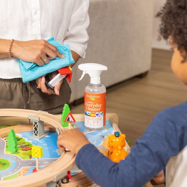 Every time you wipe a highchair, kitchen table, or toy bin with harsh chemicals, a little more lands on the places your family and pets touch most. Their hands, bare feet, and paws absorb those residues with every touch.