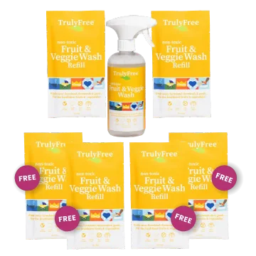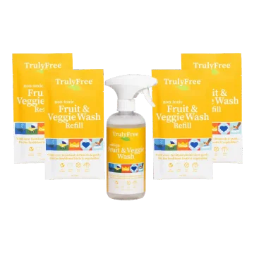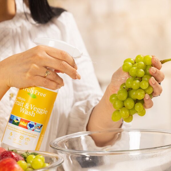 With the power of citric acid and grapefruit oil terpenes Truly Free Home's Fruit & Veggie Wash is safely able to eat through the pesticides, waxes, and oils.