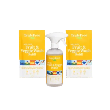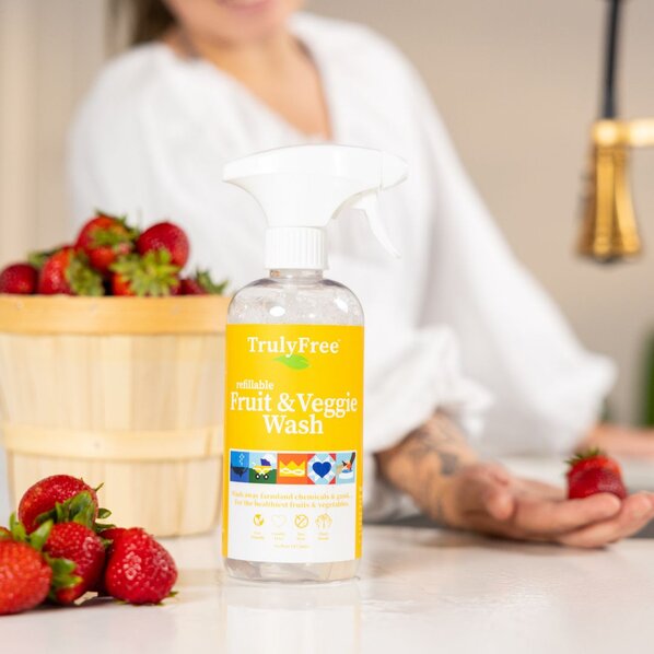 Truly Free Home's Fruit and Veggie Wash is made with gentle and naturally derived ingredients, free from harsh chemicals and artificial additives, providing you with a safe and reliable cleaning solution for your fruit and vegetables. It’s made with 3 simple ingredients: deionized water, citric acid, and grapefruit oil terpenes.