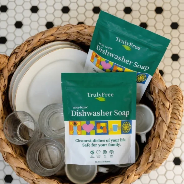 Biodegradable and phosphate-free, Truly Free Home's Dishwasher Soap contains naturally derived enzymes that safely break down grease, food, and residue to avoid anything re-depositing on your dishes—even in hard water.