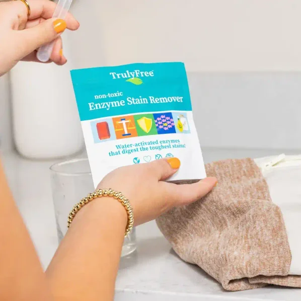 Truly Free Home’s Enzyme Stain Remover is a laundry booster made with water-activated naturally derived enzymes that digest the toughest stains and break down organic materials.