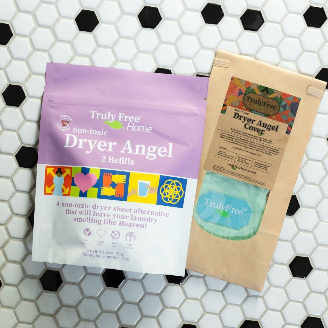The refillable Dryer Angel is a sustainable & safe dryer sheet alternative that softens and lightly scents your clothes without any toxins.