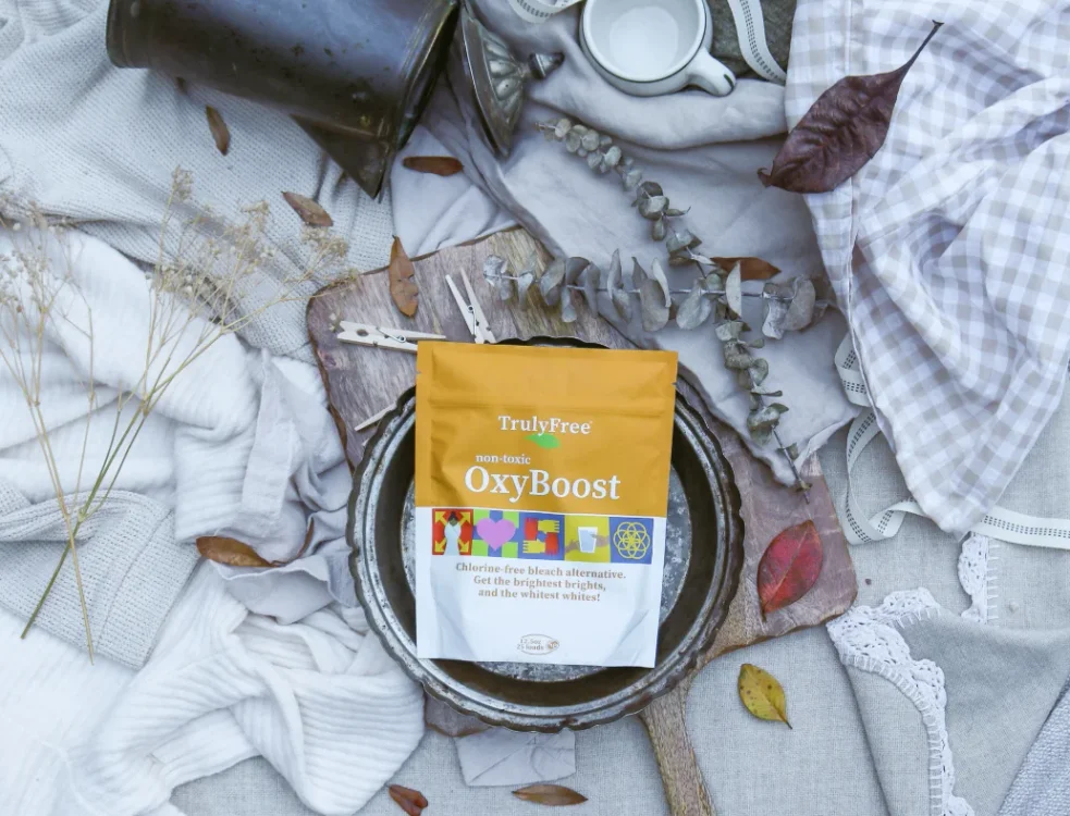 Truly Free Home’s OxyBoost is an oxygen‑powered, color‑safe bleach alternative that lifts stains and brightens without chlorine, optical brighteners, or harsh additives.