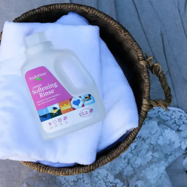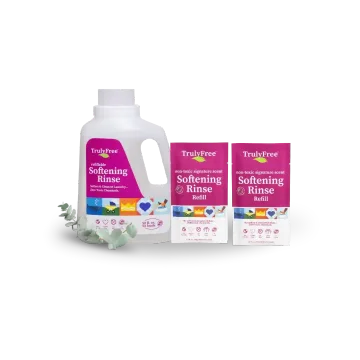 Truly Free Home’s Softening Rinse is a non-toxic and eco-friendly alternative to fabric softener that softens the water in your machine for ultra-soft fabrics. Instead of coating your laundry in harsh chemicals, this clean-rinsing formula neutralizes the minerals in hard water that leave laundry feeling stiff. It also reduces static cling and decreases drying time. All with plant-powered ingredients.