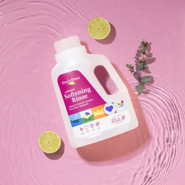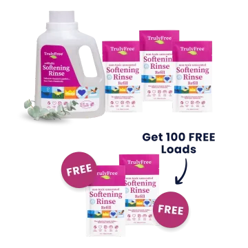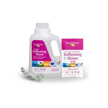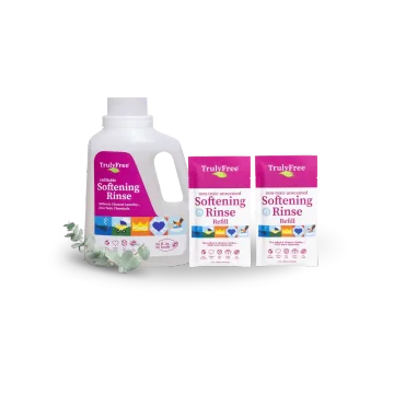 Truly Free Home’s Softening Rinse is a non-toxic and eco-friendly alternative to fabric softener that softens the water in your machine for ultra-soft fabrics. Instead of coating your laundry in harsh chemicals, this clean-rinsing formula neutralizes the minerals in hard water that leave laundry feeling stiff. It also reduces static cling and decreases drying time. All with plant-powered ingredients.