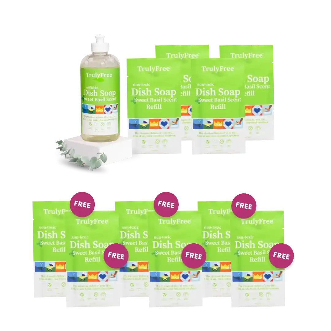 Every time you order refills of Truly Free Home’s non-toxic cleaning laundry and cleaning supplies, you help save single-use plastics from ever being made.