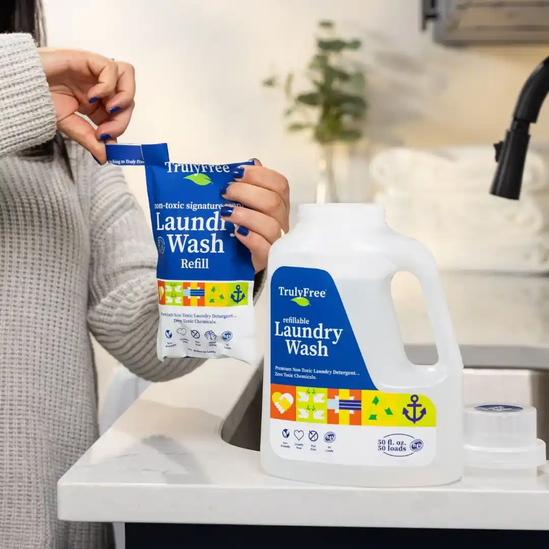 The first time you order, you will get a free container—on us! After that, our system only sends you refills. Every time you order refills of Truly Free Home’s non-toxic cleaning laundry and cleaning supplies, you help save single-use plastics from ever being made.