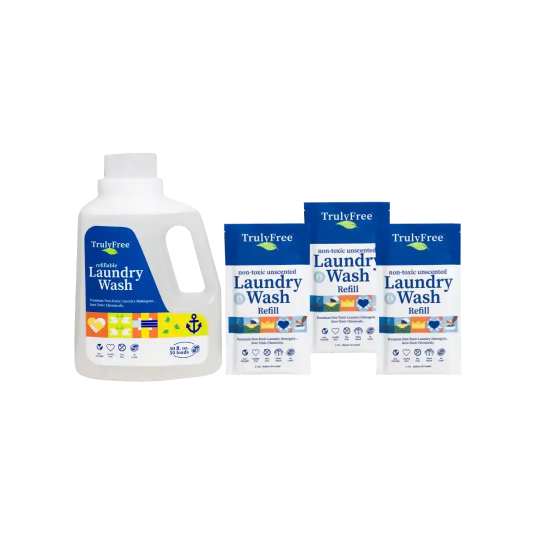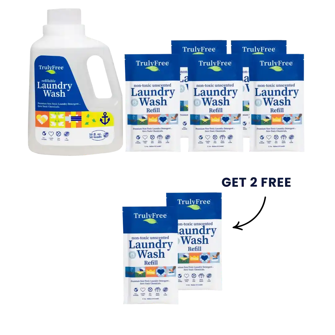 The first time you order, you will get a free container—on us! After that, our system only sends you refills. Every time you order refills of Truly Free Home’s non-toxic cleaning laundry and cleaning supplies, you help save single-use plastics from ever being made.